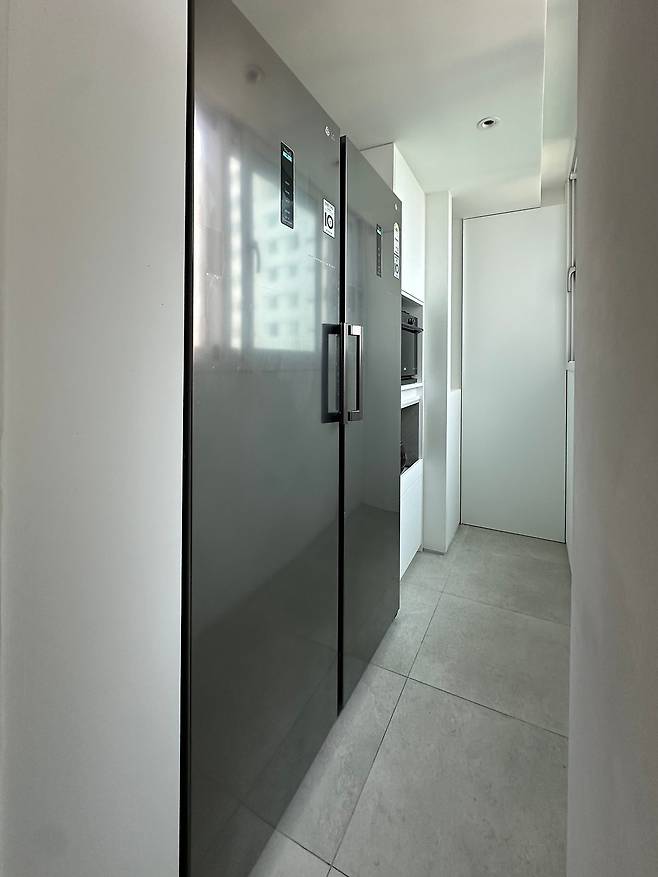 냉장고와 나머지 소가전이 정리되어 있는 베란다입니다. 앞쪽 주방에서 가전이 보이지 않으니 훨씬 더 깔끔하고, 자주 사용하는 가전이 한데 모여있으니 오히려 활용도가 높아지더라고요. 지금까지 만족하며 잘 지내고 있습니다.