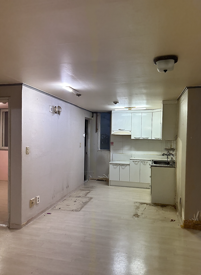 이전 모습을 좀 더 자세히 소개하자면 현관에 들어오자마자 오래된 나무로 된 작은 신발장이 있고, 거실 벽에는 분전함이 그대로 드러나 있었는데요. 여기에 색이 바랜 강아지 벽지도 붙어있었습니다. 또 주방은 냉장고, 소가전, 식탁을 놓을 수 없을 정도로 협소한 상황이었습니다. 평수에 비해서도 협소한 방 2개와 거실보다 큰 안방, 샤워할 공간조차 없던 화장실까지 크고 작은 문제가 많았습니다.