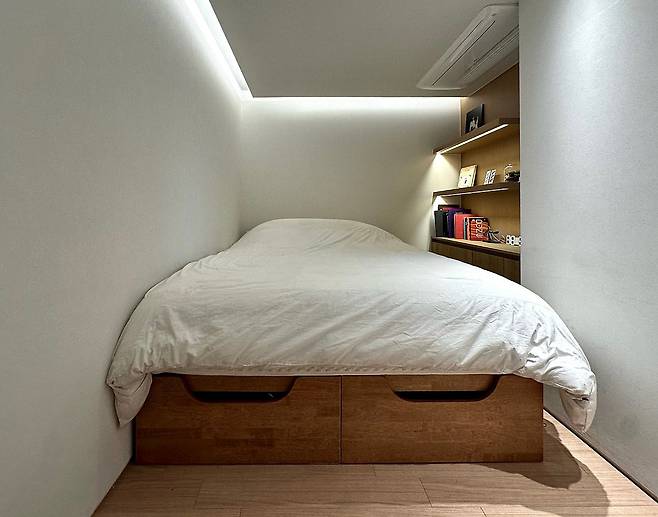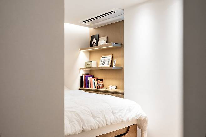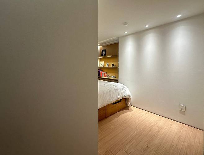 저희는 특이하게 안방으로 나온 넓은 방이 아닌 비교적 작은방에 침실을 만들었어요. 그래서 침대가 방을 꽉 채우고 있는 모습이 되었는데, 덕분에 아늑함이 배가 되었어요. 주로 밤에 자기 전에 침실로 들어가는 저희 부부에게는 최적의 구조가 아닐까 싶습니다.