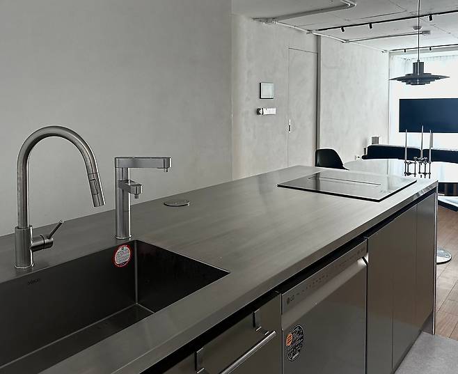 우여곡절이 많았던 아일랜드장은 아직까지도 아주 잘 사용하고 있어요. 상판과 측판 모두 스테인리스라 시각적으로 시선을 사로잡는 효과가 있고, 양쪽에서 요리를 할 수 있어 공간 활용 측면에서도 아주 효율적입니다. 또 하부장도 최대한 활용하고 싶어 빌트인 정수기, 식기세척기, 주방 용품과 그릇 수납장을 넣어두었습니다. 아일랜드 뒤쪽의 키큰장에는 청소기, 청소용품, 커피 머신, 강아지 사료와 강아지 용품, 식재료, 상비약 등을 정리해두었습니다.