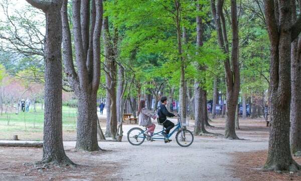 남이섬을 제대로 만끽하려면 자전거 라이딩이 제격이에요. 섬의 크기는 약 1.5km × 4.5km로, 도보로는 다소 넓게 느껴질 수 있지만 자전거를 이용하면 섬 전체를 여유롭게 돌아볼 수 있습니다.