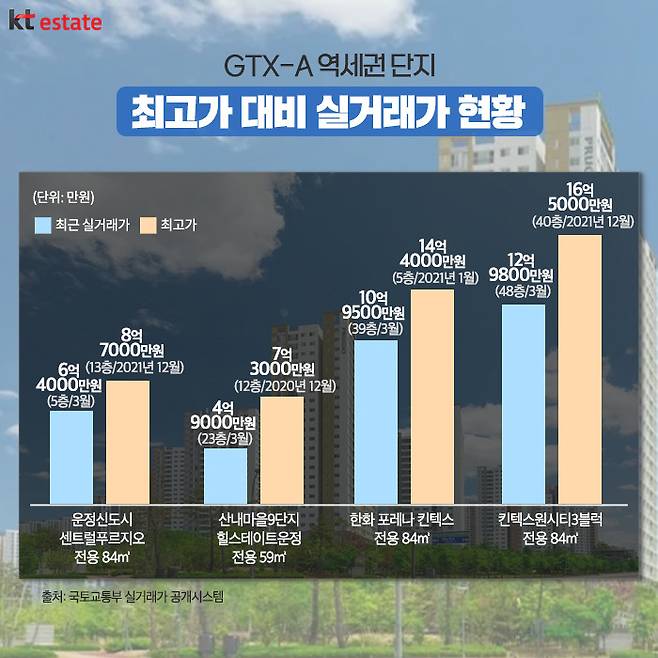 GTX-A 운정중앙역, 킨텍스역 인근 역세권 아파트들의 상황은 어떨까요? 국토교통부 실거래가 공개시스템에 따르면 파주시 목동동 ‘운정신도시 센트럴푸르지오’ 전용면적 84㎡는 3월 6억4000만원(5층)에 거래됐습니다. 1월 6억7000만원(8층)에 비해 3000만원 하락한 것은 물론, GTX에 대한 기대감으로 시세가 크게 상승했던 2021년 12월 최고가 8억7000만원(13층)과 비교해도 2억원 이상 낮은 가격입니다.