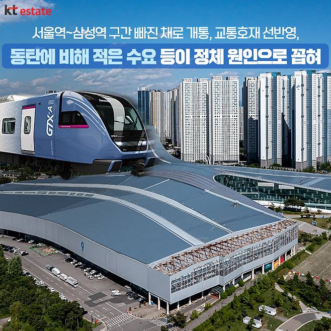 그렇다면 왜 이렇게 같은 노선인데도 북측과 남측의 시세 상승에 희비가 엇갈리는 걸까요? 그 원인은 우선 GTX-A의 핵심이라 할 수 있는 서울역~삼성역 구간이 빠진 채로 개통돼 강남으로의 접근성이 여전히 떨어진다는 분석입니다. 여기에 2021년 주택시장 상승기 때 개통 효과가 기반영됐다는 점과 파주, 일산은 동탄에 비해 배후수요가 부족하다는 점 등이 결국 시세 상승에 큰 영향을 미치지 못한다고 분석되고 있습니다.