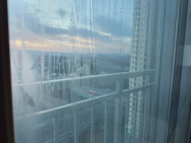 보이시나요? 물이 줄줄 흐른 저 흔적. 비 온 거 아니에요. 유리창의 실리콘에는 물방울이 맺혀있어요. 저 맺힌 물을 닦아주지 않으면 곰팡이가 생겨요.