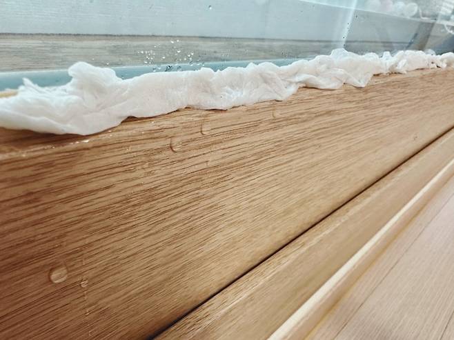 올겨울 유달리 결로 현상이 심해졌어요. 작년엔 이 정도 까진 아니었는데, 물이 맺히다 못해 줄줄 흘러서 창틀에 고이더라고요.