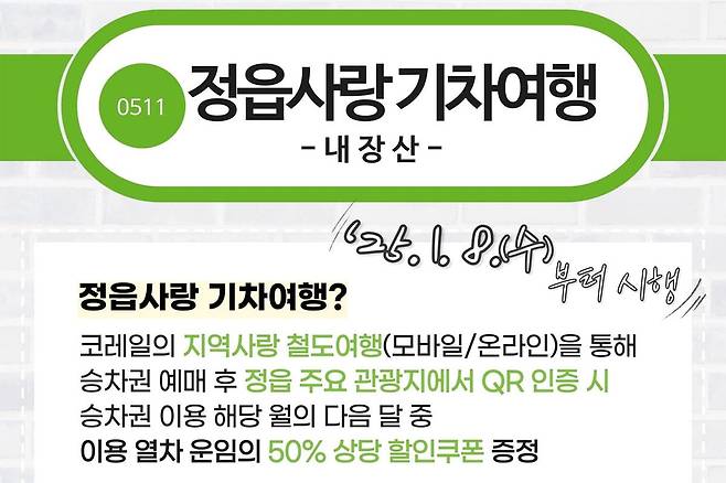 낭만적인 기차 여행과 소도시의 매력을 동시에 느낄 수 있는 기회, 바로 ‘정읍 반값 기차여행’입니다.