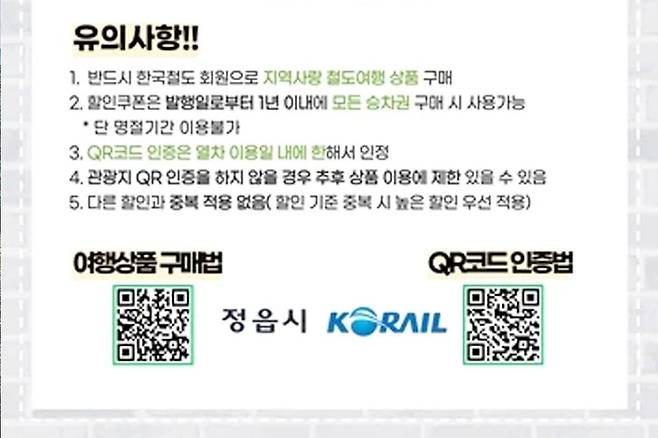 또한, 내장산국립공원, 구절초지방정원, 월영습지, 솔티숲 등 정읍의 주요 관광지 10곳에 설치된 QR코드를 코레일톡 앱에서 인증해야 합니다.