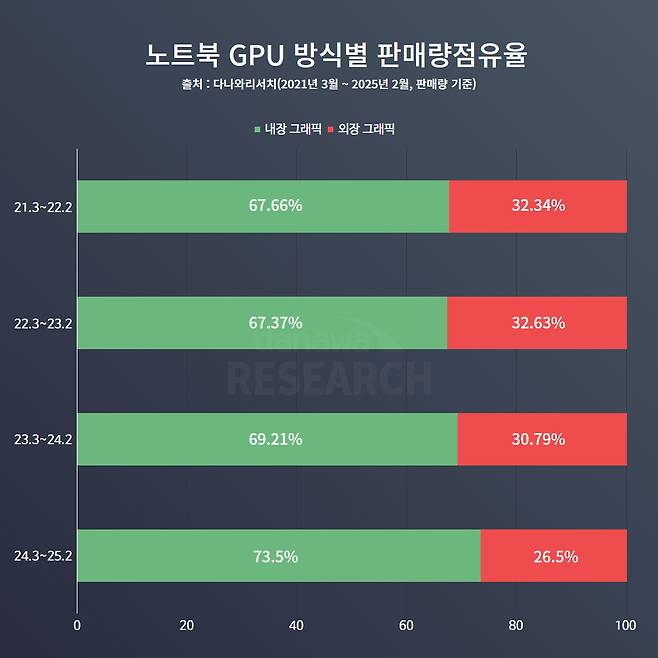 최근 1년 동안 판매된 노트북 중 내장 그래픽을 탑재한 제품의 비중이 꾸준히 증가하고 있다. 4년 전인 2021년부터 2023년까지는 소폭 상승세를 유지하며 60% 후반대의 판매 점유율을 기록했지만, 2024년과 2025년에 들어서면서 결국 73.5%까지 상승했다.