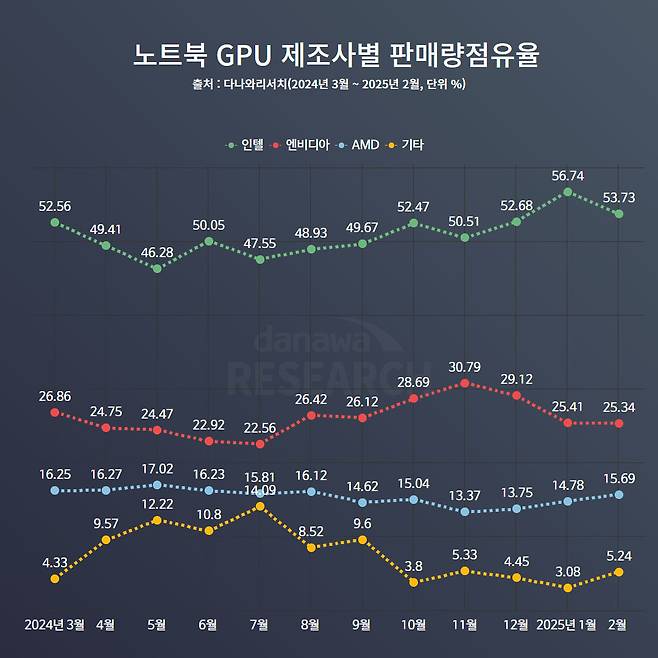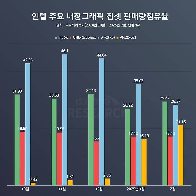 인텔의 내장 그래픽 칩셋만을 기준으로 보면, 루나레이크의 약진이 두드러진다. 2024년 10월 출시된 루나레이크는 이전 Xe 아키텍처를 사용하던 메테오레이크 CPU의 점유율을 빠르게 잠식하더니, 2025년 2월에는 결국 21.16%의 점유율을 기록하며 기존 보급형 그래픽 코어인 UHD Graphics의 점유율을 넘어섰다. 특히, 아직 노트북 시장의 성수기인 3월 아카데미 시즌의 판매량이 반영되지 않은 상황이기 때문에, Xe2 기반의 점유율은 더욱 상승할 것으로 전망된다.