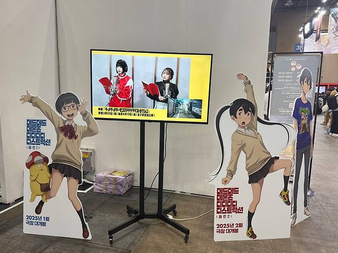 AGF 2024의 <데데디디: 파트1> 공식 부스에서는 강렬한 비주얼의 포토존과 함께 영화의 주인공 ‘카도데’, ‘오란’, ‘오바’ 그리고 영화의 마스코트인 ‘침략자’와 ‘이소베양’의 모습을 담은 등신대가 방문객들을 맞이했다. 이어, 공동 주연 및 주제곡에 참여한 요아소비(YOASOBI)의 이쿠타 리라와 아노가 한국 팬들에게 전하는 인사 메시지와 성우 녹음 현장을 엿볼 수 있는 영상을 공개해 눈길을 끌었다.