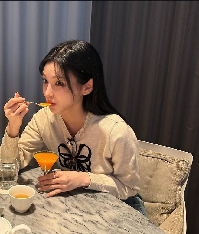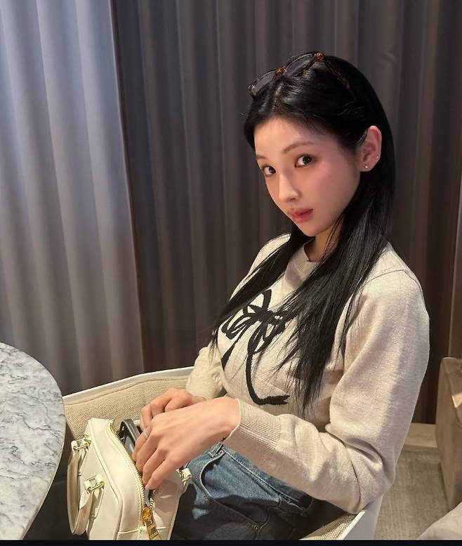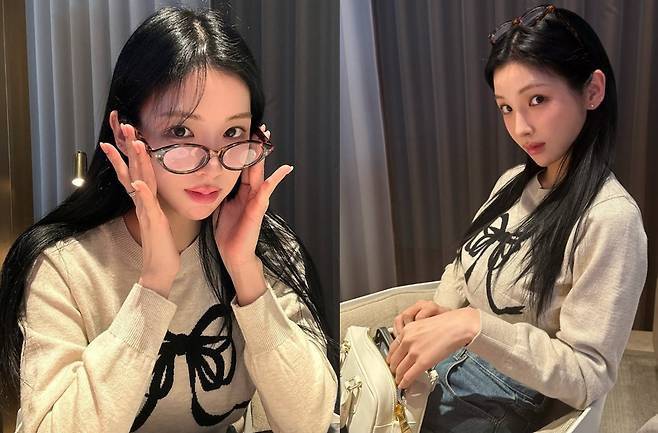 강다은은 크림 컬러 니트에 블랙 리본 디테일을 매치해 클래식하면서도 러블리한 무드를 연출했습니다.