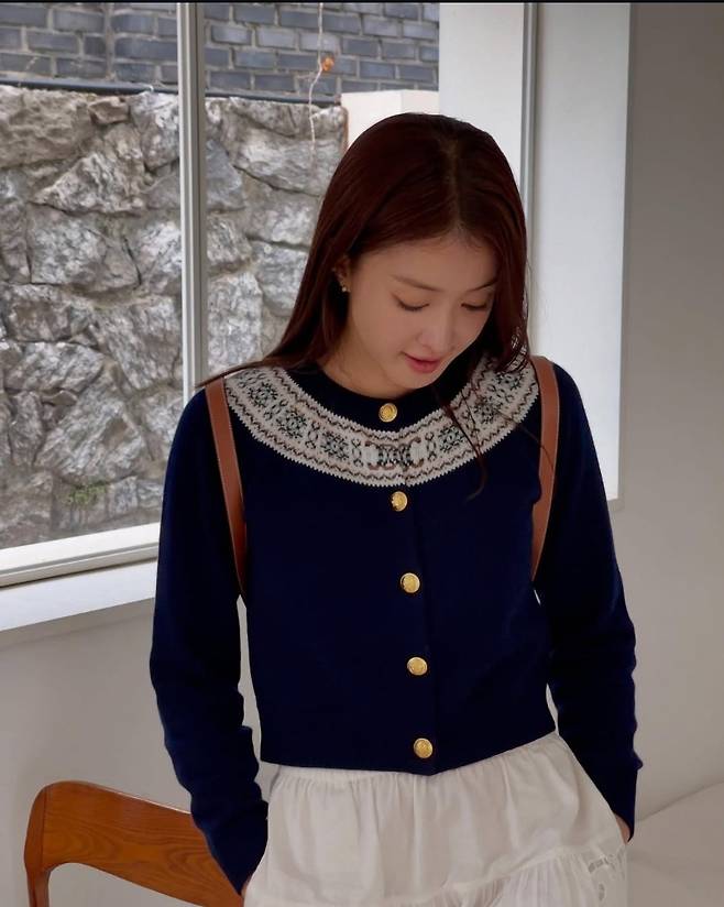이시영은 진청빛에 가까운 네이비 니트 카디건을 착용해 포근하면서도 단정한 분위기를 자아냈습니다.