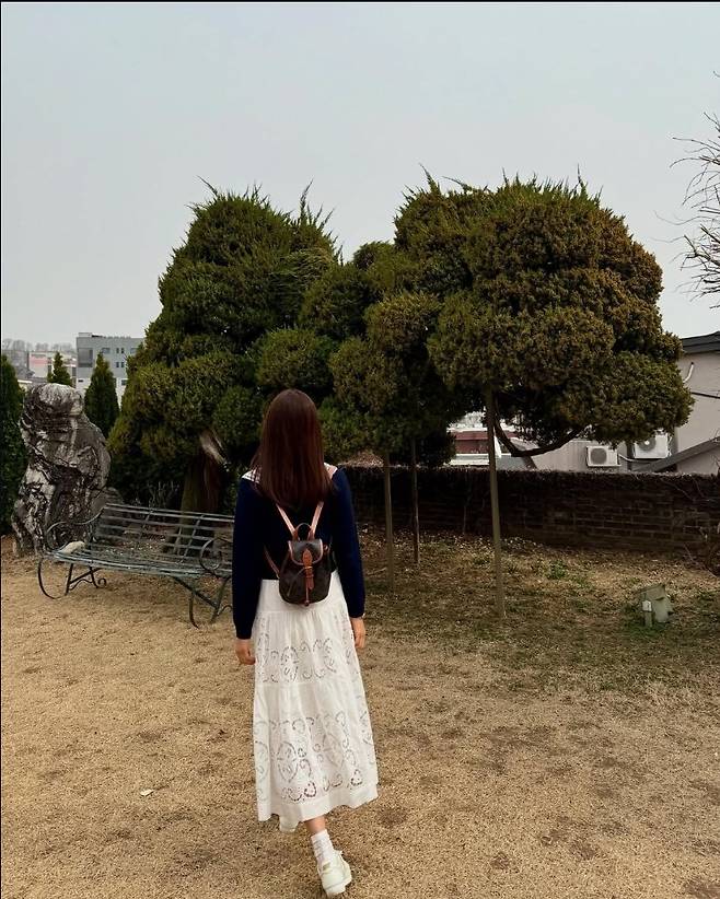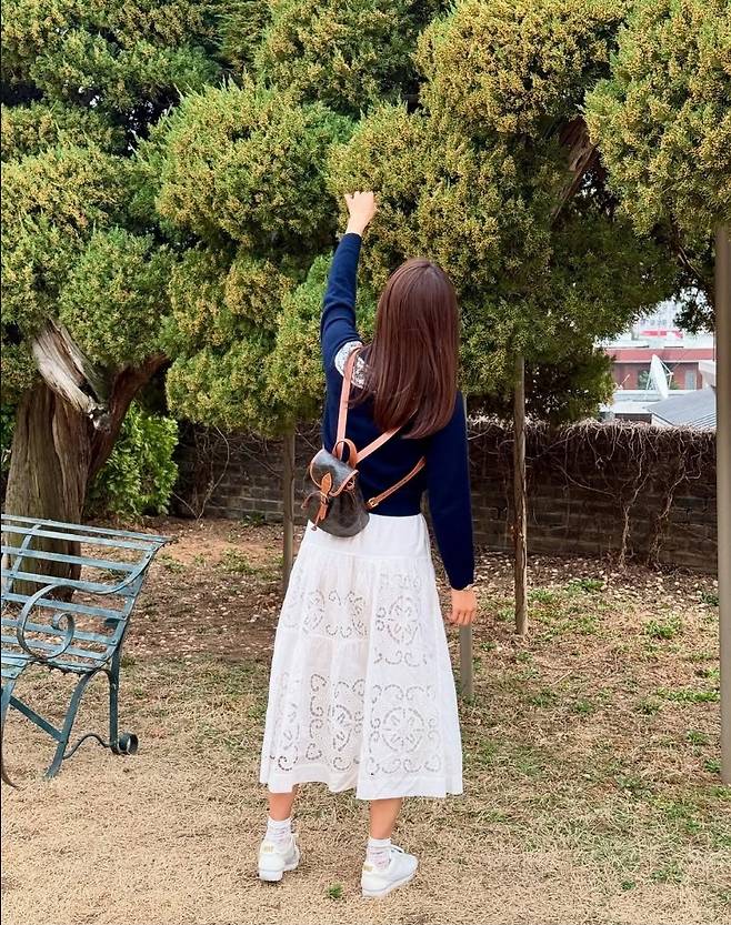 스커트는 펀칭 디테일이 더해진 화이트 롱 레이스 스커트를 선택해 시선을 자연스럽게 아래로 흐르게 했으며, 전체적인 코디에 여성스러움과 우아함을 동시에 불어넣었습니다.