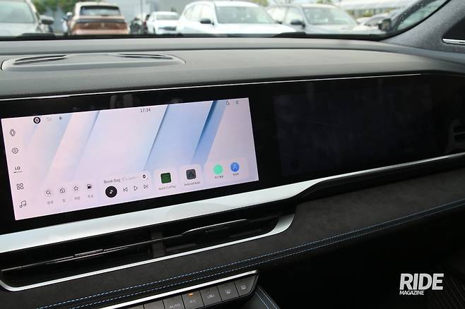 갈 때는 조수석에 앉게 되어 편의 기능들 위주로 살펴보기로 했다. 일단 인포테인먼트에서 가장 중요한 내비게이션은 티맵과의 협력으로 티맵 오토가 탑재되어 있는데, 단순히 내비게이션 기능은 물론이고 안내 시 헤드업 디스플레이에까지 연동되어 가야하는 방향의 표시가 함께 나타나 편리하다. 취향에 따라서는 좀 더 자세한 정보를 얻길 원하는 사람도 있는데, 센터 디스플레이에 내비게이션이 띄워진 상태에서 3개의 손가락을 대고 왼쪽으로 쓸어주면(스와이프) 계기판에 내비게이션 화면이 함께 표시된다. 이 기능은 내장된 티맵 오토에서만 적용되므로 편하게 쓰고 싶다면 이쪽을 선택하는게 낫지 싶다. 이 스와이프로 화면을 옮기는 기능은 센터 스크린과 조수석 스크린 사이에서도 가능한데, 이쪽은 주로 음악이나 OTT 등 엔터테인먼트 컨텐츠들만을 주고 받을수 있다.