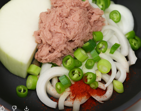 4️⃣ 참치와 채소 넣기무가 어느 정도 익으면 참치와 양파, 고추, 대파, 꽈리고추를 넣고 5~10분 더 끓입니다.