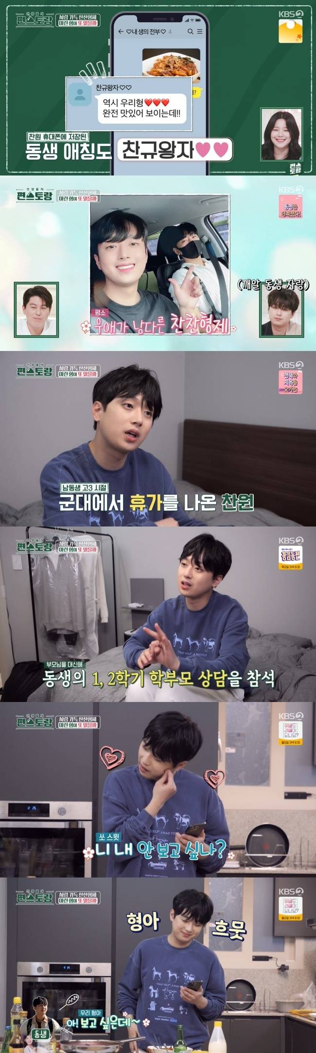 이찬원은 동생을 ‘찬규왕자♡’로 저장할 정도로 우애를 과시했다. 이찬원은 “동생도 요리를 잘한다”라고 자랑했다.