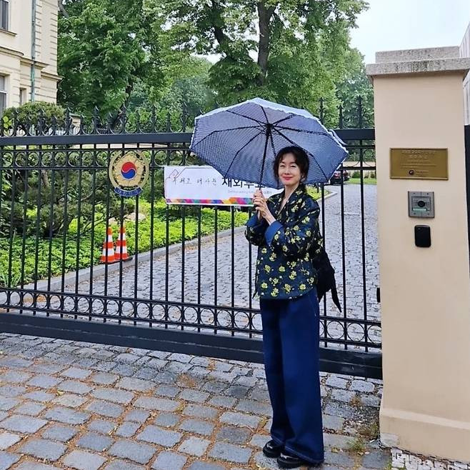 비 오는 날의 외출이 이렇게 멋질 수 있다는 걸 보여준 김지수의 이날 룩은, 우산마저 패션이 되는 진짜 배우의 아우라를 입증하는 순간이었습니다.