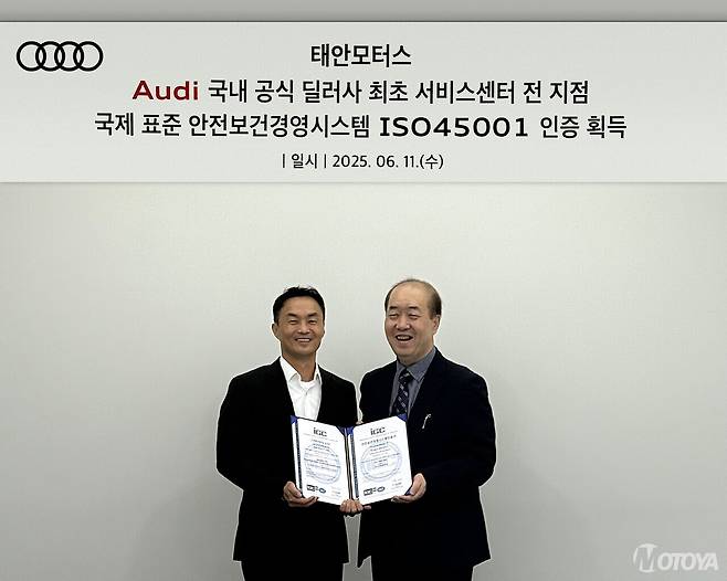 아우디 공식딜러사 (주)태안모터스(대표: 강형규, 서덕중) 가 국내 아우디 공식딜러 중 최초로, 전국 모든 서비스 지점에 대해 산업안전보건경영시스템 국제표준(ISO 45001) 인증을 획득했다고 밝혔다.