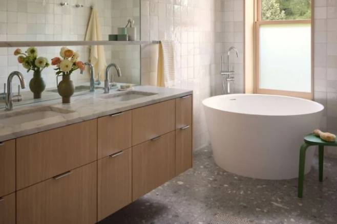 2층에는 침실과 욕실이 자리한다. 일본에서 생활한 경험이 있는 아내의 취향이 욕실 디자인에 고스란히 녹아들었다. 안방 욕실에는 커다란 욕조가 높은 창문 아래에 놓여 있고, 머리 위 천창에서 빛이 쏟아져 마치 야외에서 샤워하는 듯한 느낌을 자아낸다.