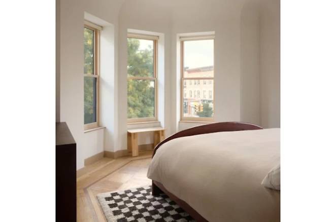 침실은 간결하되 따뜻하다. 나무 패널이 바닥 몰딩 높이까지 이어지고, 낮은 천장 부분은 곡선으로 처리해 누에고치처럼 포근하게 감싸는 공간이 됐다.