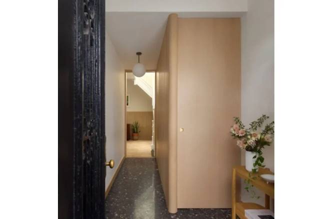 흰색 참나무로 만든 캐비닛과 패널이 집 전체를 관통하며 각 방을 이어준다. 기존 나무 바닥은 패널과 색조를 맞춰 다시 마감했고, 통행이 잦은 공간에는 테라조를 깔았다. 소재는 적지만 일관성이 있어 오히려 공간이 더 넓고 조용하게 읽힌다.