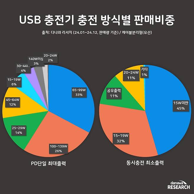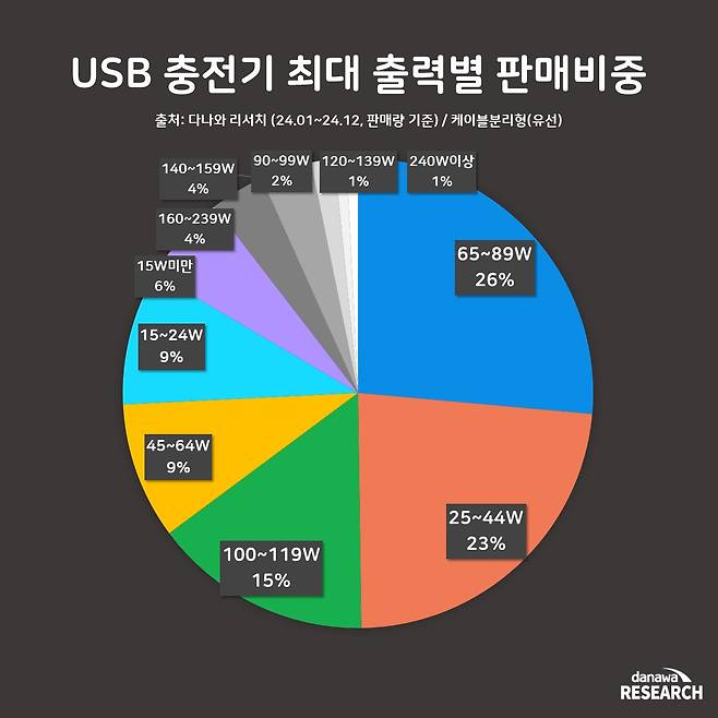 케이블 분리형 충전기의 최대 출력별 판매 비중은 65~89W 제품이 26%로 가장 높은 점유율을 차지했다. 이어서 25~44W 제품이 23%, 100~119W 제품이 15%를 기록하며, 일반적인 출력의 제품부터 고출력 제품까지 두루두루 판매되는 것으로 나타났다.