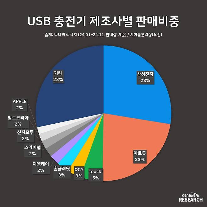 2024년 제조사별 판매 비중은 삼성전자와 아트뮤가 각각 28%와 23%를 차지하며 시장을 주도하고 있다. 삼성전자는 브랜드 신뢰도와 고품질 제품으로 높은 점유율을 유지하고 있으며, 아트뮤는 가성비와 다양한 충전기 라인업으로 소비자들의 주목을 받았다. USB 충전기 시장은 대형 제조사와 중소 브랜드의 경쟁이 계속될 전망이다. 기타 중소 브랜드는 혁신적인 기술과 가격 경쟁력을 내세워 틈새시장을 공략해야 할 것으로 보인다.