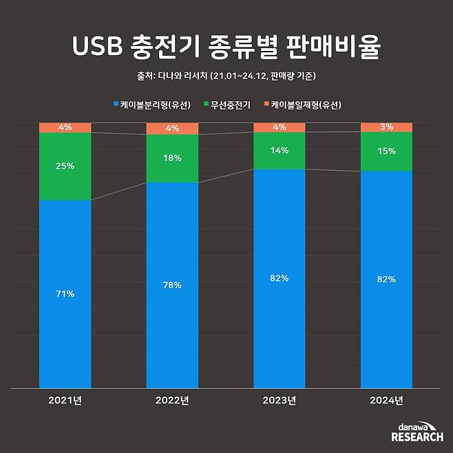 지난 4년간 USB 충전기 판매 동향을 살펴보면, '케이블 분리형 충전기'가 시장을 주도하며 71%에서 82%로 꾸준히 상승했다. 호환성과 휴대성이 뛰어난 점이 소비자 선호를 이끌어낸 주요 요인으로 분석된다. 반면, '무선 충전기'는 2021년 25%에서 2024년 15%로 점유율이 하락했다.