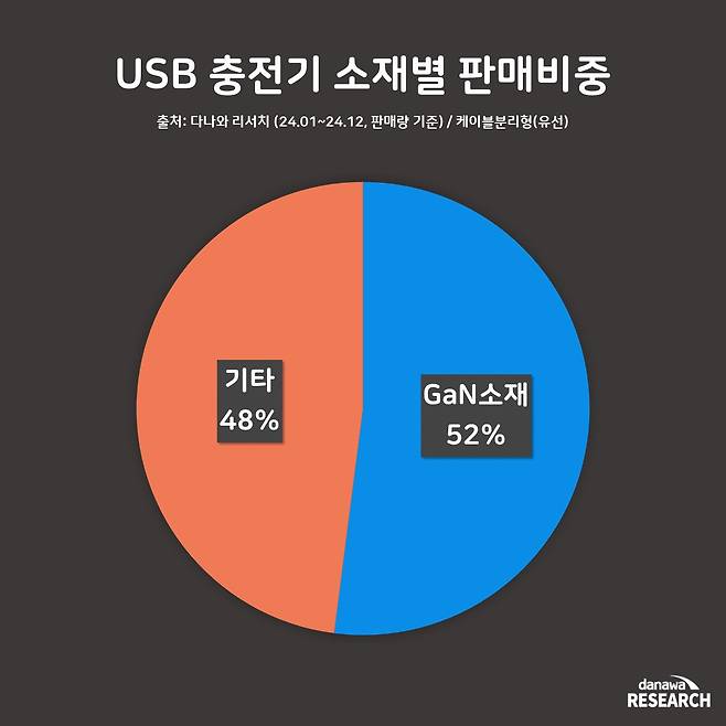 GaN(질화갈륨) 충전기는 고출력, 고효율을 특징으로, USB 충전기 시장에서 52%를 차지하며 과반을 넘어섰다. 기존 충전기에 비해 가볍고 휴대성이 뛰어나 소비자들 사이에서 큰 인기를 얻고 있지만, 상대적으로 높은 가격이 단점으로 지적된다. 올해는 기술 발전과 생산 효율성 향상을 통해 가격이 점차 안정화될 것으로 예상된다.