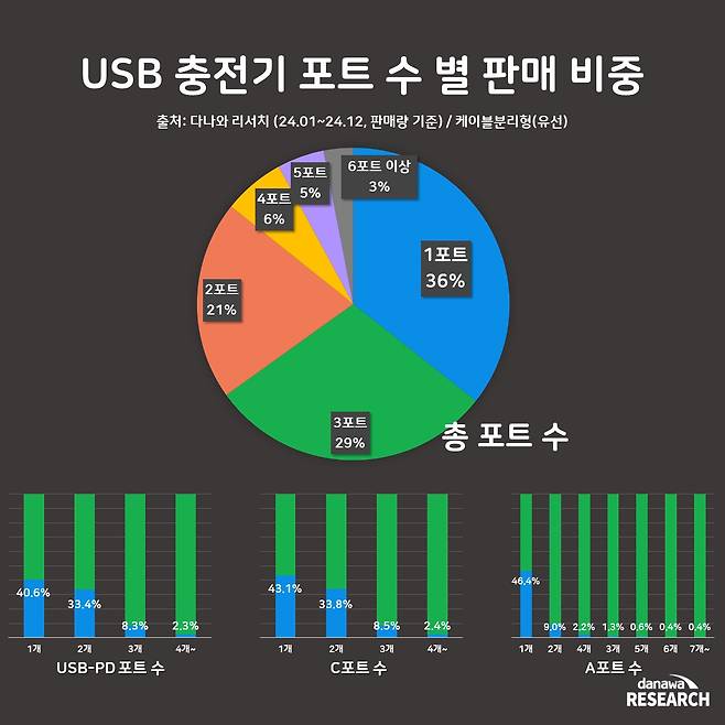 지난 1년간 케이블 분리형 충전기의 포트 수별 판매 비중을 분석한 결과, 1포트(36%), 3포트(29%), 2포트(21%) 순으로 선호됐다. 반면 4포트 이상의 다포트 제품은 14%로 비교적 낮은 비중을 기록했다. 소비자들이 다수의 포트를 탑재한 제품보다는 개인 스마트 기기만을 깔끔하고 효율적으로 충전할 수 있는 1~3포트 제품을 선호하는 경향을 보여준다.