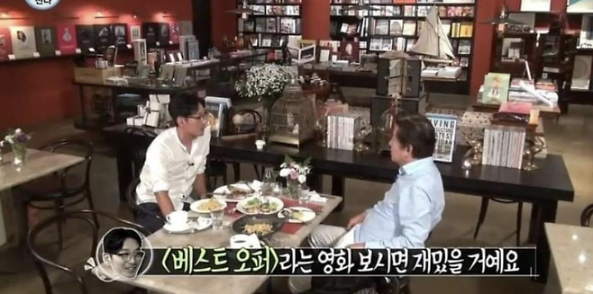 둘 다 배우인 탓에 아버지와 일 적인 이야기를 많이 하기도 하겠지요. 대화 도중 하정우는 영화 '베스트 오퍼'를 추천하며 "70 넘은 아저씨랑 20대랑 사랑하는 이야기"라고 소개를 이었습니다.