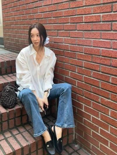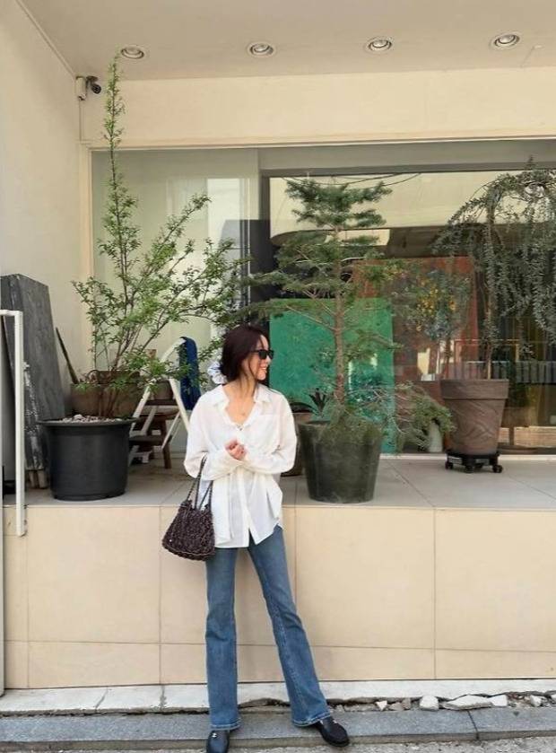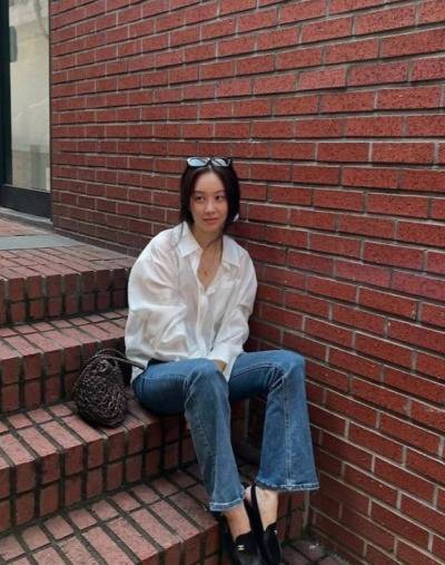 정려원님은 루즈핏 화이트 셔츠에 부츠컷 데님 팬츠를 매치해서 심플하면서도 세련된 실루엣을 완성했어요. 🤍 여기에 블랙 로퍼와 짜임 디테일이 돋보이는 브라운 니트백을 더해 캐주얼하면서도 따뜻한 느낌을 더했답니당! 👜