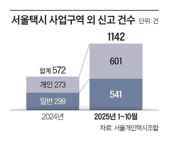 13일 서울개인택시조합에 따르면 김포시에 접수된 서울 택시 사업구역 외 영업 관련 신고는 2024년 572건(일반 299건, 개인 273건)에서 지난해 10월 기준 1142건(일반 541건, 개인 601건)으로 크게 늘었다. 여객자동차 운수사업법에 따라 택시가 등록된 사업구역이나 업무범위를 벗어나 영업할 경우, 각 지자체는 과징금 부과부터 면허 취소까지 행정처분을 내릴 수 있다. 그런데 조합에 따르면 접수된 신고 중 대부분은 전기차 충전을 위한 정차나 화장실 이용 등으로 행정처분 대상에 해당하지 않았다.