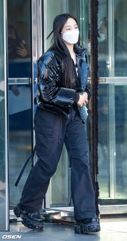 민지는 블랙 색상의 카고팬츠를 블랙 유광패딩과 신발과
