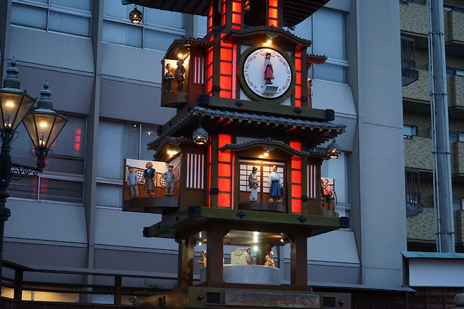 열차 옆 도고온천 상점가 입구에는 도고온천 본관 100주년을 기념해서 제작된 ‘봇짱 카타쿠리 시계탑’이 배치되어 있는데요. 평일 아침 8시부터 오후 10시까지 정각마다 약 5분에서 10분 정도 귀여운 공연을 한답니다. 또한 시계탑 옆으로는 공연을 기다리며 족욕을 할 수 있는 공간이 마련되어 있어 많은 사람들이 족욕을 하고 있는 모습도 볼 수 있죠.