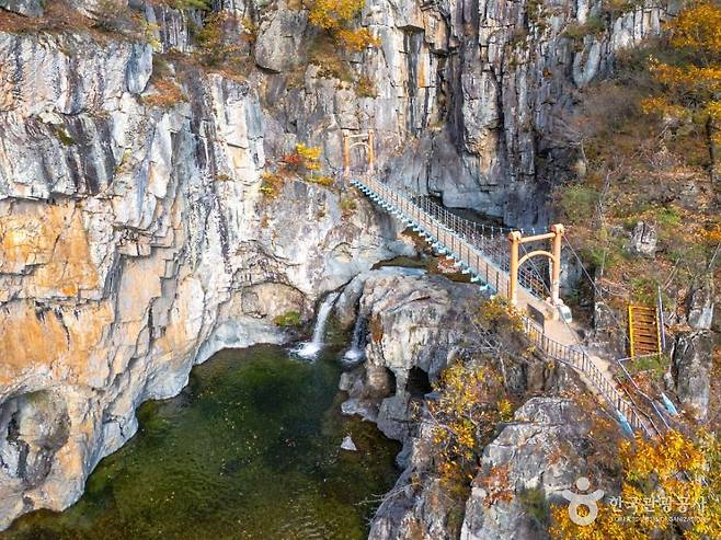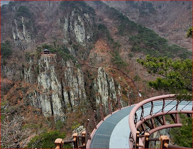 아래를 내려다보면 연산폭포와 구름다리가 함께 보이는데, 위에서 내려다보는 폭포 풍경은 또 다른 인상을 줍니다. 기암절벽 위 정자 형태의 전망대와 아래로 떨어지는 폭포의 대비가 특히 인상적이라, 많은 이들이 이곳에서 20분 이상 머무르게 됩니다.