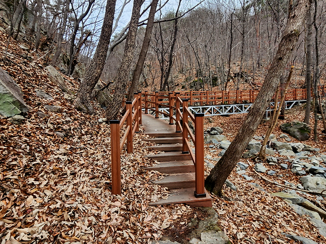 보현암을 지나 소금강전망대로 향하는 구간은 약 15~20분 정도 소요됩니다. 거리만 보면 짧아 보이지만, 연속되는 오르막 데크길이 이어져 체력 소모는 조금 있는 편입니다. 다만 경사가 일정하고 길이 정비돼 있어 천천히 호흡을 조절하며 오르면 큰 부담은 없습니다.