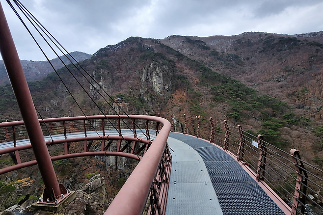 아래를 내려다보면 연산폭포와 구름다리가 함께 보이는데, 위에서 내려다보는 폭포 풍경은 또 다른 인상을 줍니다. 기암절벽 위 정자 형태의 전망대와 아래로 떨어지는 폭포의 대비가 특히 인상적이라, 많은 이들이 이곳에서 20분 이상 머무르게 됩니다.