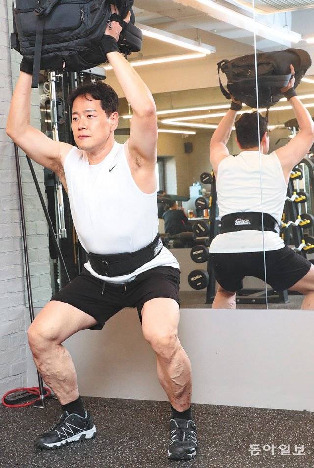 임진홍 강남세브란스병원 간담췌외과 교수는 한때 체중이 127kg까지 불어났지만 최근 2년 동안 운동과 식이요법을 통해 35kg을 감량하는 데 성공했다. 임 교수의 최종 목표는 80kg이다. 임 교수가 헬스클럽에서 근력 운동을 하고 있다. 안철민 기자 acm08@donga.com