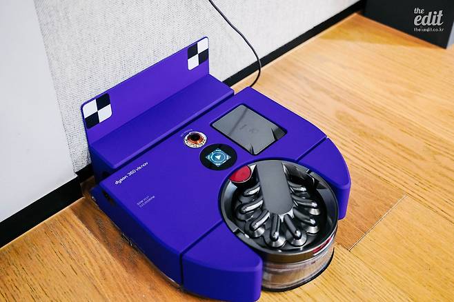 그런데 다이슨이 꺼내놓은 ‘다이슨 360 비스 나브(Dyson 360 Vis Nav)’ 청소기는 다른 것보다 일단 예뻤습니다. 다이슨에 가장 기대하는 딱 그 스타일의 원과 직선이 단정하게 라인을 만들어 내고, 비비드한 블루 컬러가 강렬한 인상을 남깁니다. 익숙한 다이슨 청소기의 롤러는 큼직하게 앞을 장식하고 강력한 다이슨의 소형 모터가 들어가 있습니다.