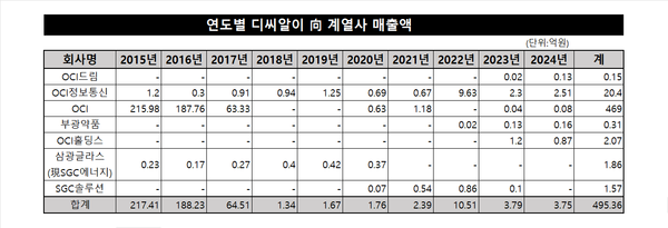 반면 10년 동안 지속적으로 매출을 기록한 계열사는 OCI정보통신이 유일했다. DCRE가 2008년 동양제철화학 인천공장 사업부문에서 분리·독립한 이후, 2010년부터 매년 IT 서비스 구축 및 유지 관련 매출을 냈다.