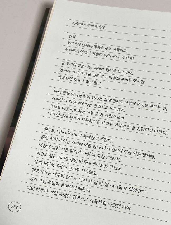 이어 "푸바오, 너는 나에게 참 특별한 존재란다. 많은 사람이 힘든 시기에 너를 만나 다시 일어설 힘을 얻은 것처럼, 너한테 말한 적은 없지만 사실 나 또한 그랬거든. 어렵고 힘든 시기를 겪던 와중에 푸바오를 만났고, 함께하면서 조금씩 상처를 치유했고, 행복이라는 테두리 안으로 다시 한 발 한 발 내디딜 수 있었단다. 네가 그런 특별한 존재이기 때문에 너의 하루가 매일 특별한 행복으로 가득하길 바랐던 거야"라고 애정을 보여줬습니다.