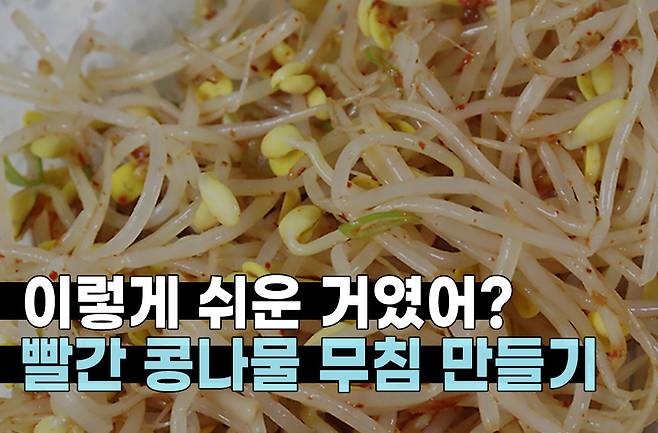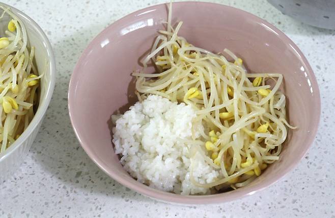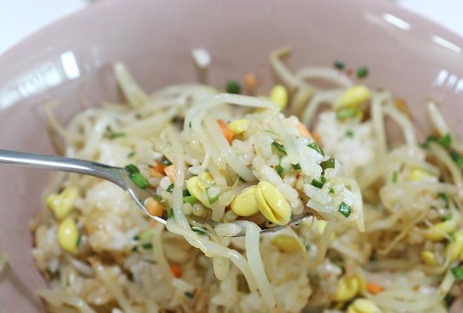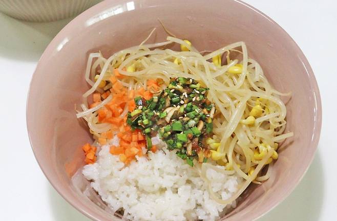 갓 지은 흰쌀밥에 데쳐서 물기를 뺀 콩나물을 올려줍니다. 색감을 위해 당근이 있다만 썰어서 넣어주세요. 만들어둔 부추양념장을 넣습니다.