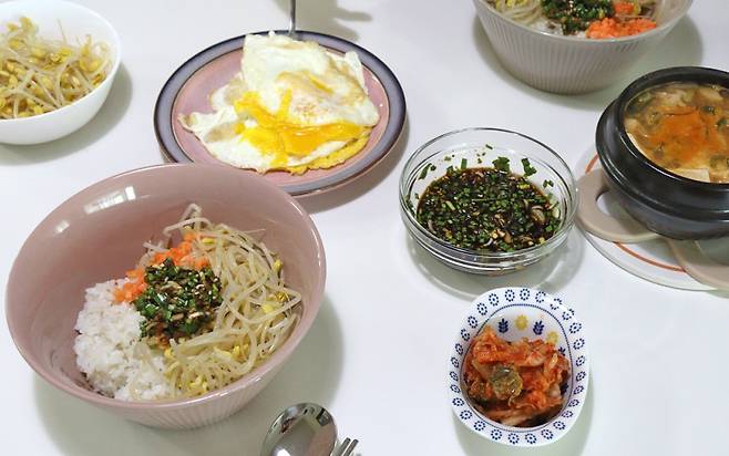 된장찌개 끓이고 고소한 계란 프라이와 잘 익은 김치하나면 다른 반찬이 필요없어요. 부추의 향긋한 향이 콩나물과 너무 잘 어울려요.