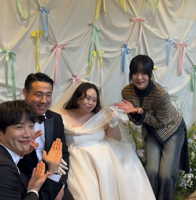 문지인은 체크 자켓에 데님팬츠로 캐주얼한 복장으로 5월 결혼식 패션을 선보임.