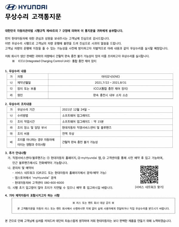 국내에서도 2021년부터 ICCU 부품 관련 이슈가 있었다. 현대자동차는 2021년 9월과 12월, ‘완속 충전 시 내부 소자 소손으로 인한 완속 충전 불가 발생 가능성에 따른 무상수리’를 진행했다. 무상수리 대상은 2021년 3월 26일~2021년 8월 31일 사이에 생산된 아이오닉5였다.