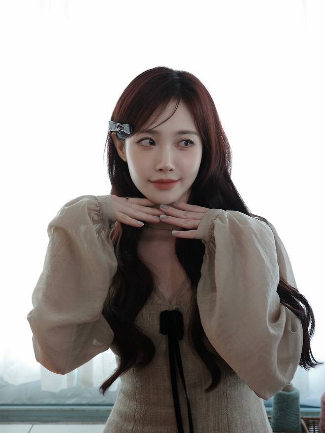 은은한 베이지 톤의 블라우스는 소매 라인이 풍성하게 퍼져서 손끝까지 여리여리해 보이고, 살짝 비침 있는 텍스처가 가벼운 몽환적인 느낌을 만들어줬어요.