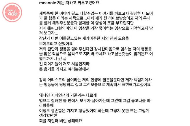 또 "너무나 많은 분들께 죄송하고 고맙다. 그걸 책임지고 살아가는 모습을 그저 지켜봐 주시고 응원해 달라"고 말했는데요. 미노이는 추후 자신이 올린 장문의 글을 SNS에서 돌연 삭제했습니다.