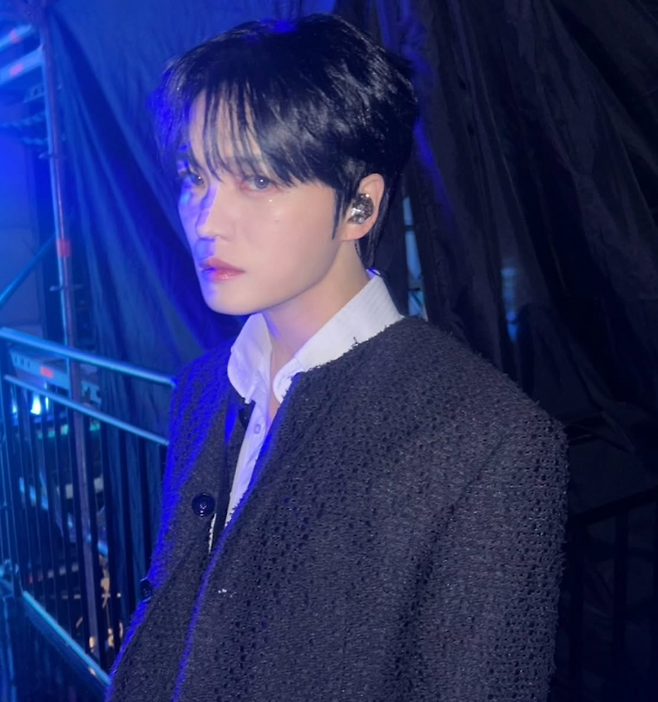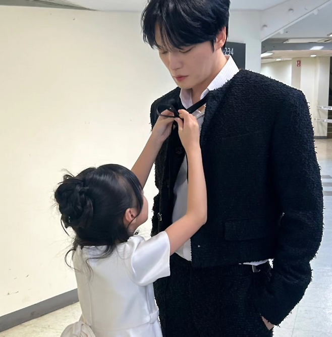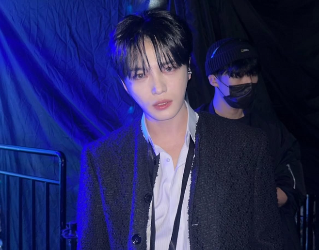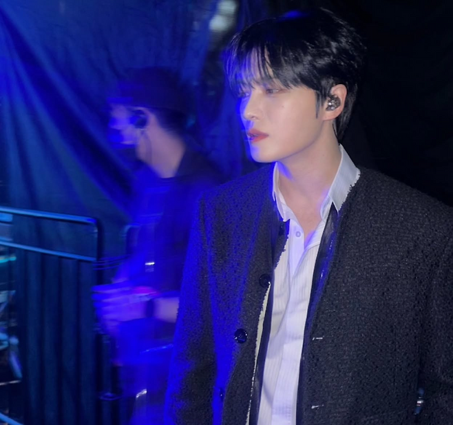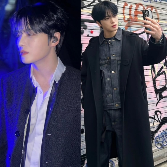 김재중 님이 선택한 블랙 트위드 재킷은 클래식하면서도 모던한 감성이 느껴지는 아이템이었어요. 트위드 특유의 텍스처 덕분에 심플한 룩에도 우아한 분위기가 더해졌죠.