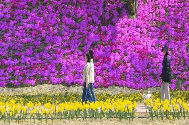 양지천 산책로를 따라 걷다 보면, 마치 꽃으로 짜인 카펫을 밟고 있는 듯한 기분이 듭니다. 자줏빛 꽃잔디는 그윽하고도 화사한 분위기를 자아내고, 노란 수선화는 햇살 아래에서 황금빛 물결처럼 반짝입니다.